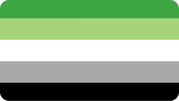 This last flag has four colours. Aromanticism is represented by dark green, the aromantic spectrum is represented by light green, relationships that are queer or nearly platonic are symbolized by white, grey is a symbol for demiromantic and grey-aromantic individuals, and finally, the range of sexuality is represented by black.