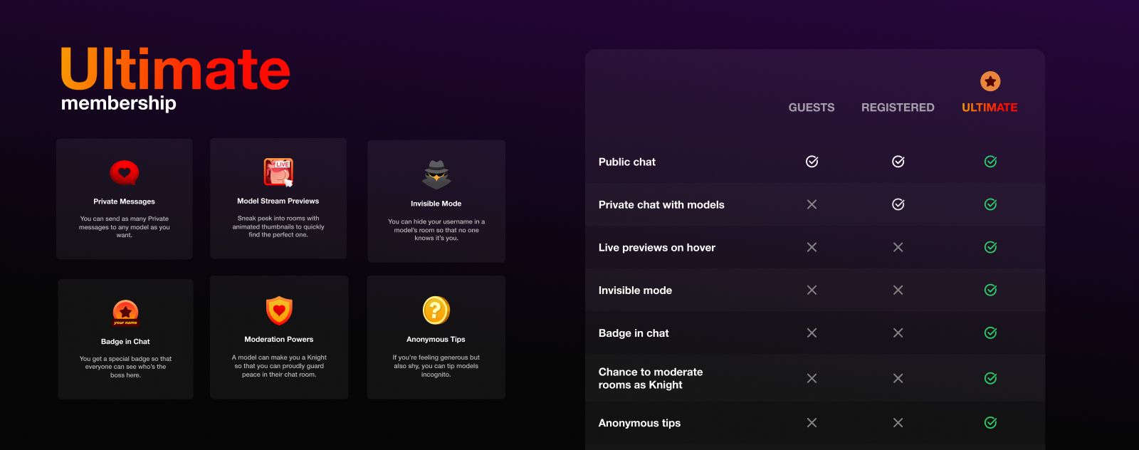 The only way to have the ultimate experience on the platform, is becoming a Ultimate member. By subscribing to this exclusive membership, you’ll gain access to a treasure trove of incredible perks. You can enjoy private messages with models, Invisible mode for free, ability to send anonymous tips, and even see a live action happening under any stream by simply hovering over it.