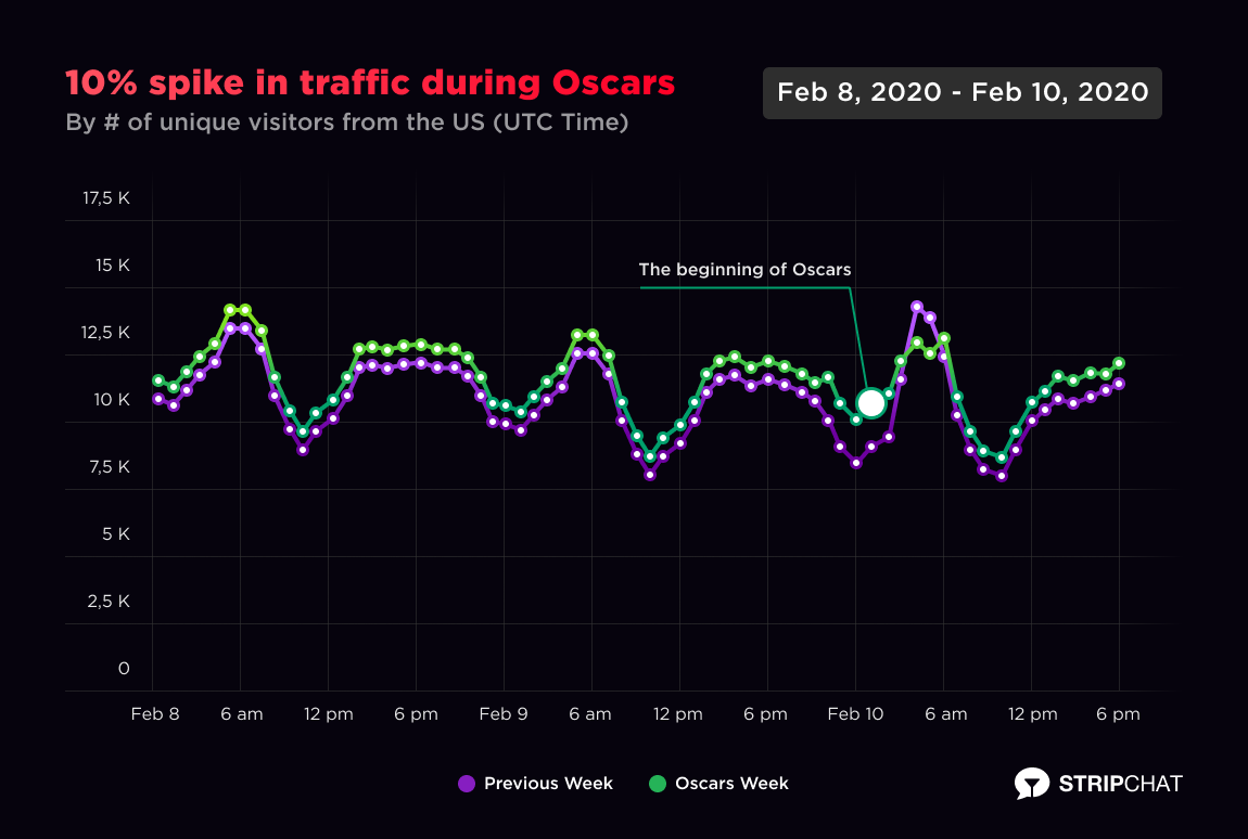 Stripchat also helped Americans find a better way to relax during the Oscars’ most intriguing or annoying introduction moments in 2020. Our data shows a 10% spike in traffic at the very beginning of the Oscars. We prefer to believe that users were seeking the best and their favorite performers on Stripchat to award them themselves. We don’t know exactly, but you are free to find the explanation which suits you best.