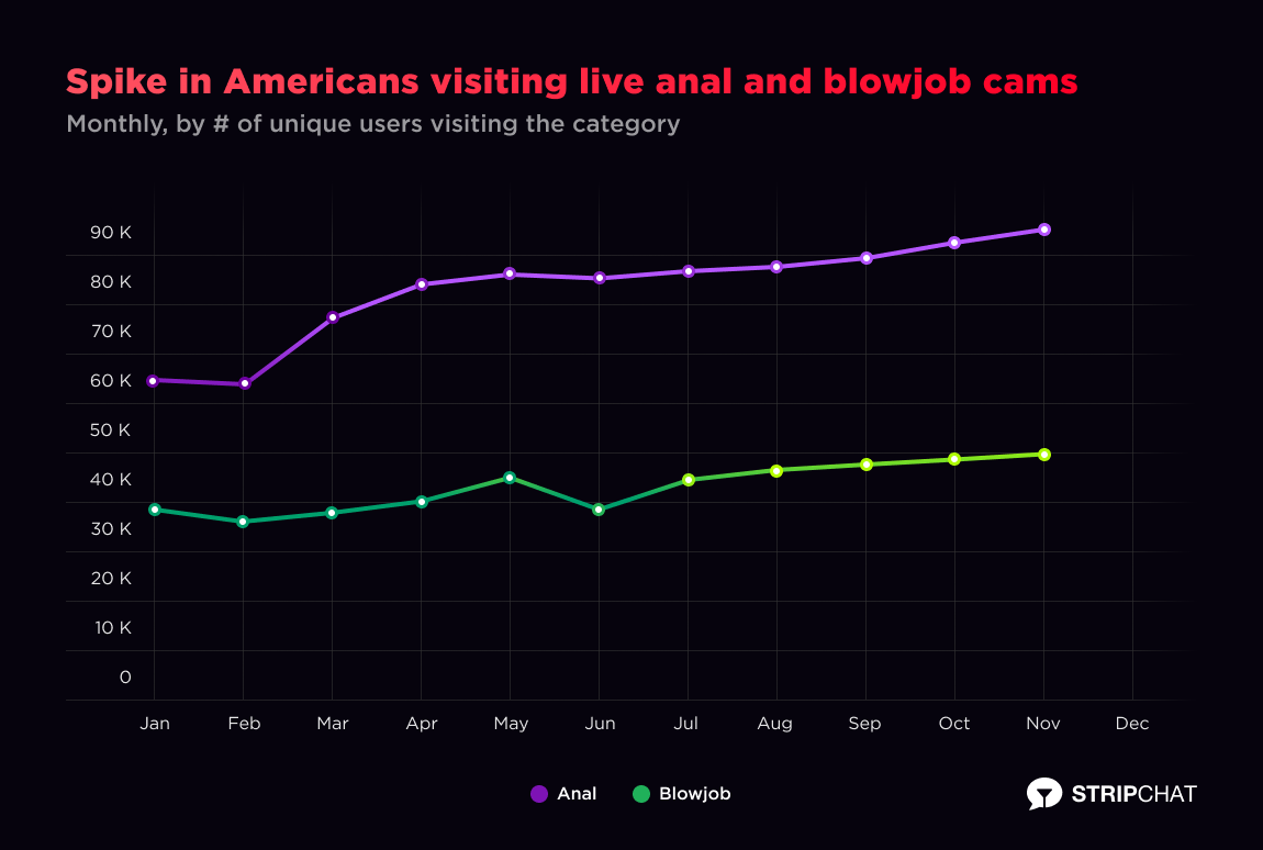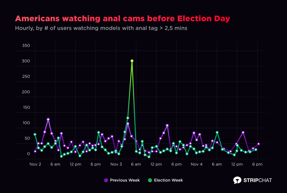 It was apparent to everyone on the internet that Americans were anxious and preparing for any possible outcome on election night. At Stripchat we saw that Americans were gearing up for the pain of being “screwed,” visiting a higher-than-average amount of models performing Anal shows a night before the presidential election.