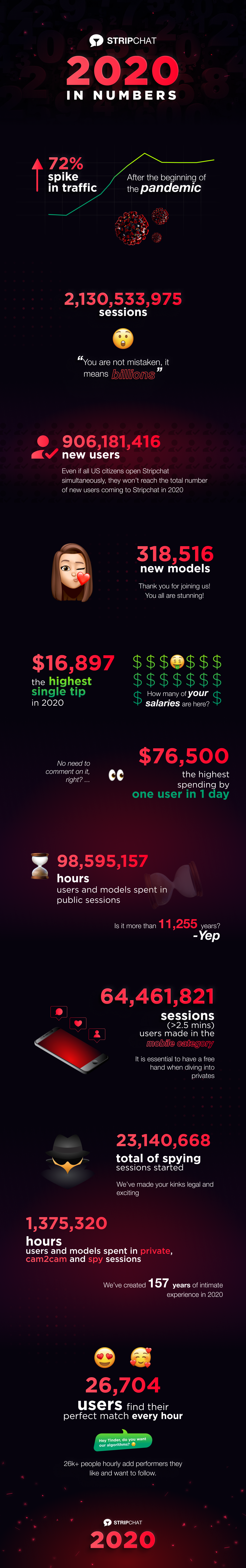 Live Cam industry sees a huge spike in traffic following the lockdown in 2020. Welcome to Stripchat, your one-stop destination when seeking the largest and most exciting online entertainment community for adults. Having hundreds of millions of users yearly, we acknowledge the value of being transparent and sharing our data with the world to introduce people globally to the live cam industry.