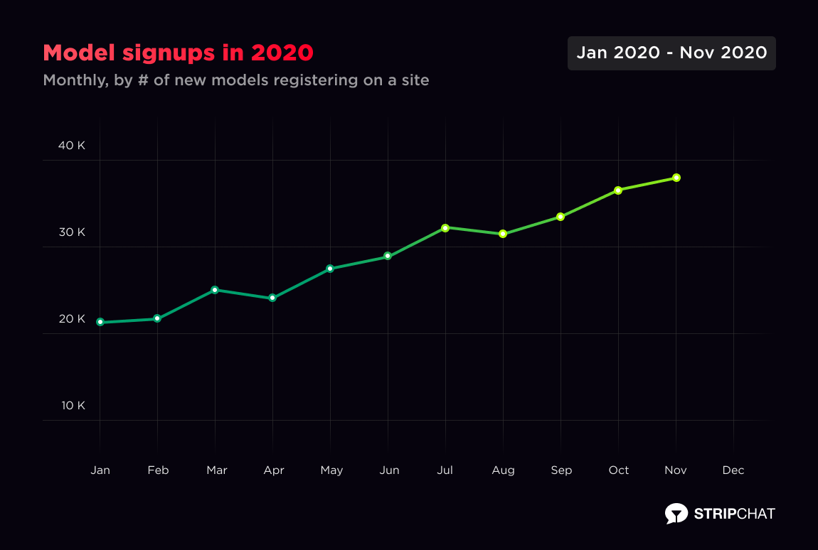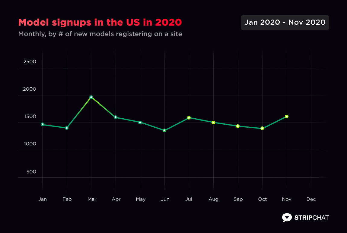 If you are curious about whether US models followed the trend of registering on Stripchat to cover their bills in 2020 or not, we’ve also seen a spike in registrations following the lockdown between March and April.