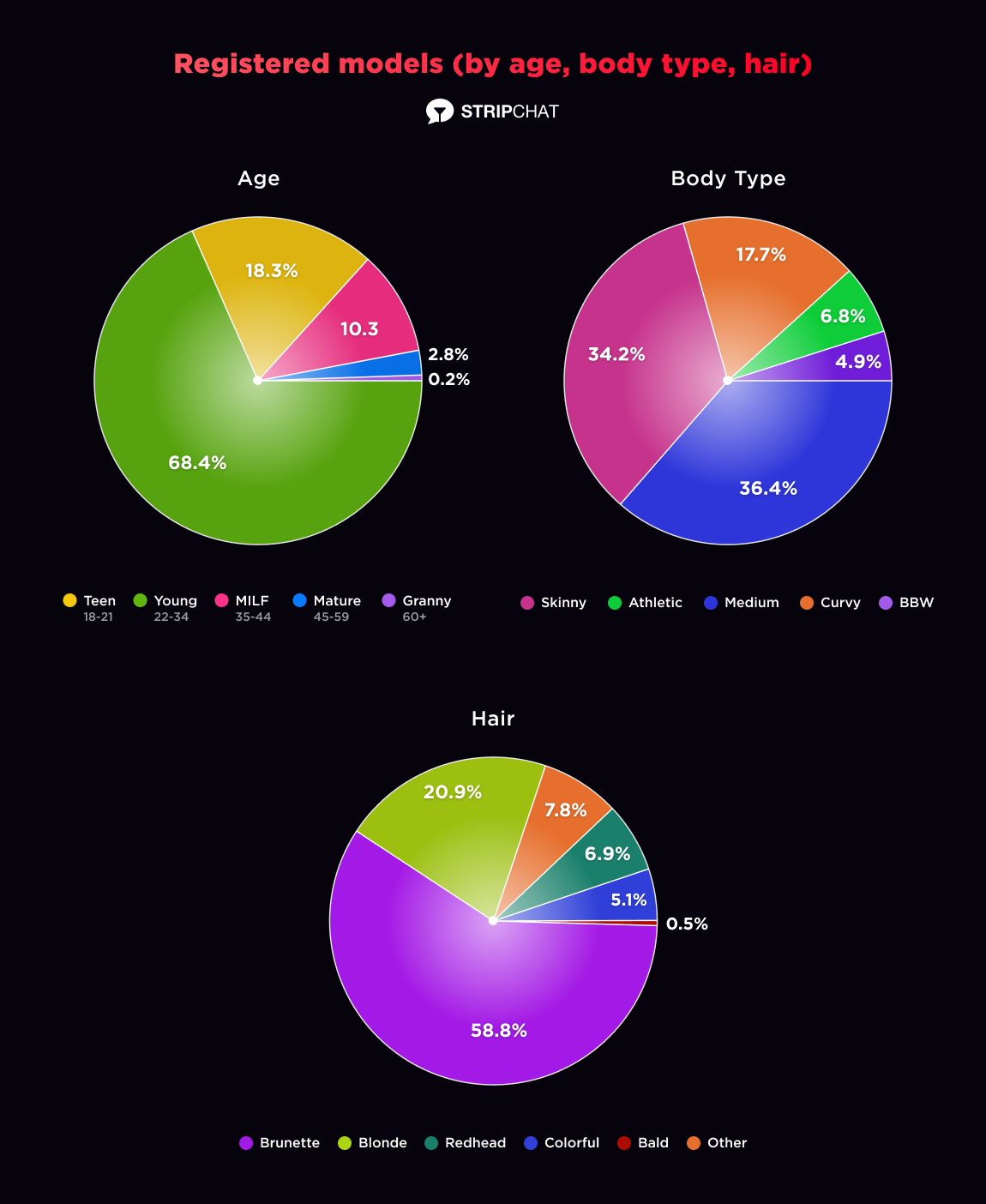 When seeking your perfect match on Stripchat, a few of the most popular segmentations are body type, age, and hair color. You might be curious about the percentages of models according to this segmentation on our platform. We are here to reveal it to you. By the way, there are still thousands of models who prefer not to specify this information; hence, the below charts show only those who did.