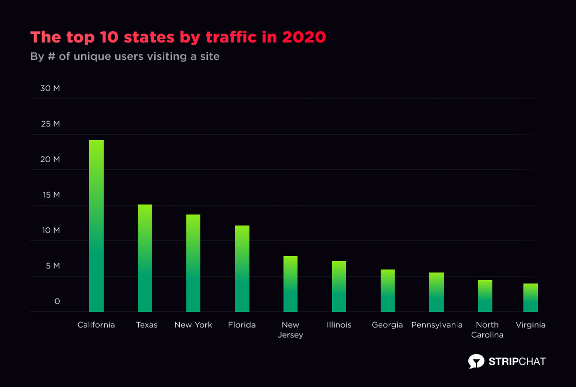 Americans took a liking to camming this year. Californians, for example, manifested that Stripchat can be a perfect place to relax and replace your regular walks in national parks banned due to the pandemic. So, while we saw growth across the United States, California, Texas, NY, Florida, and New Jersey spent the most time watching cams in 2020.