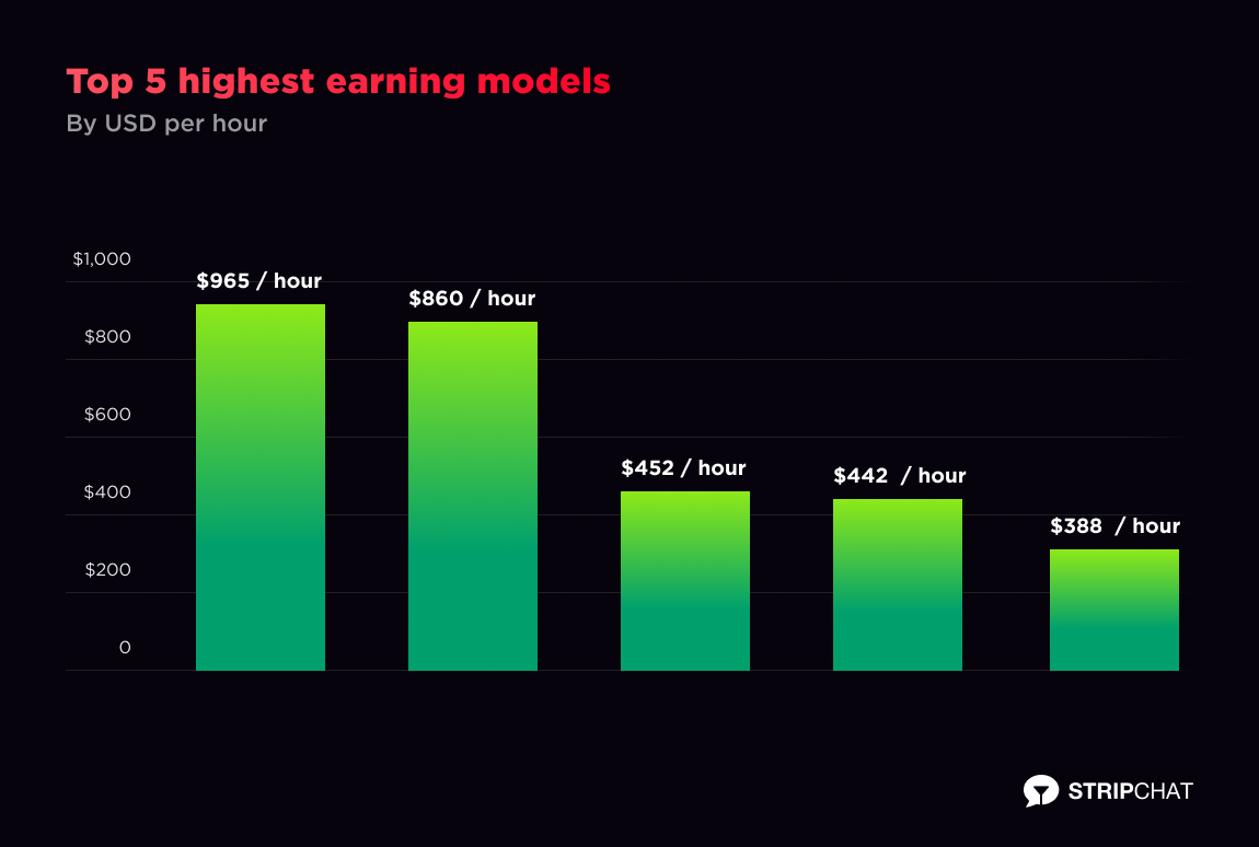 With all the above stats, you must be curious about how much money cam performers can make. Meet the Top 5 earners on Stripchat by $$$ per hour.