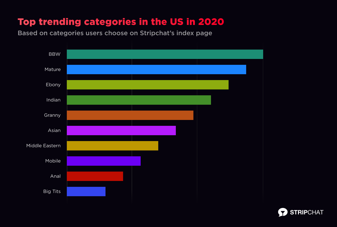 We learned a lot about our users in 2020 as lockdowns brought loneliness and revealed new preferences in girls, guys, trans, or couples. Users in the US took a new liking to BBW, Mature and Ebony models. At the same time, people worldwide turn to camming to battle pandemic fatigue: Here were the Top 10 most popular camming categories of 2020, including live sex BBW.