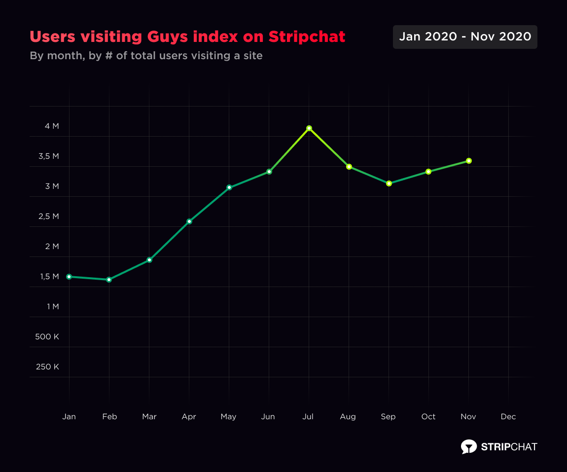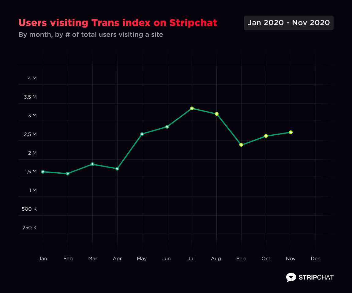 We also see a spike after the pandemic’s beginning in users visiting both trans’ and guys’ live cams in 2020. A total of 26,508,282 visited Trans cams index on Stripchat in 2020.