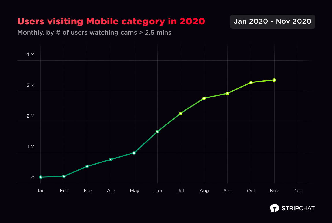 Besides using mobile devices to reach Stripchat, users keep choosing to spend time with models doing mobile broadcasts outside their homes, showing 1724% growth in unique visitors visiting mobile cams from January 2020 to December 2020.